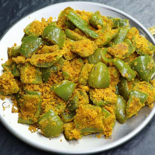 Gradually add the roasted besan to the capsicum while stirring continuously to coat the vegetables evenly.