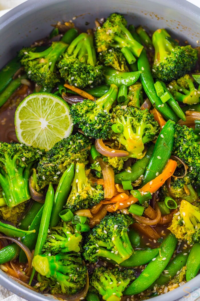 Pour in the soy sauce and lemon juice. Toss everything together to ensure the broccoli and other vegetables are well-coated with the sauce.