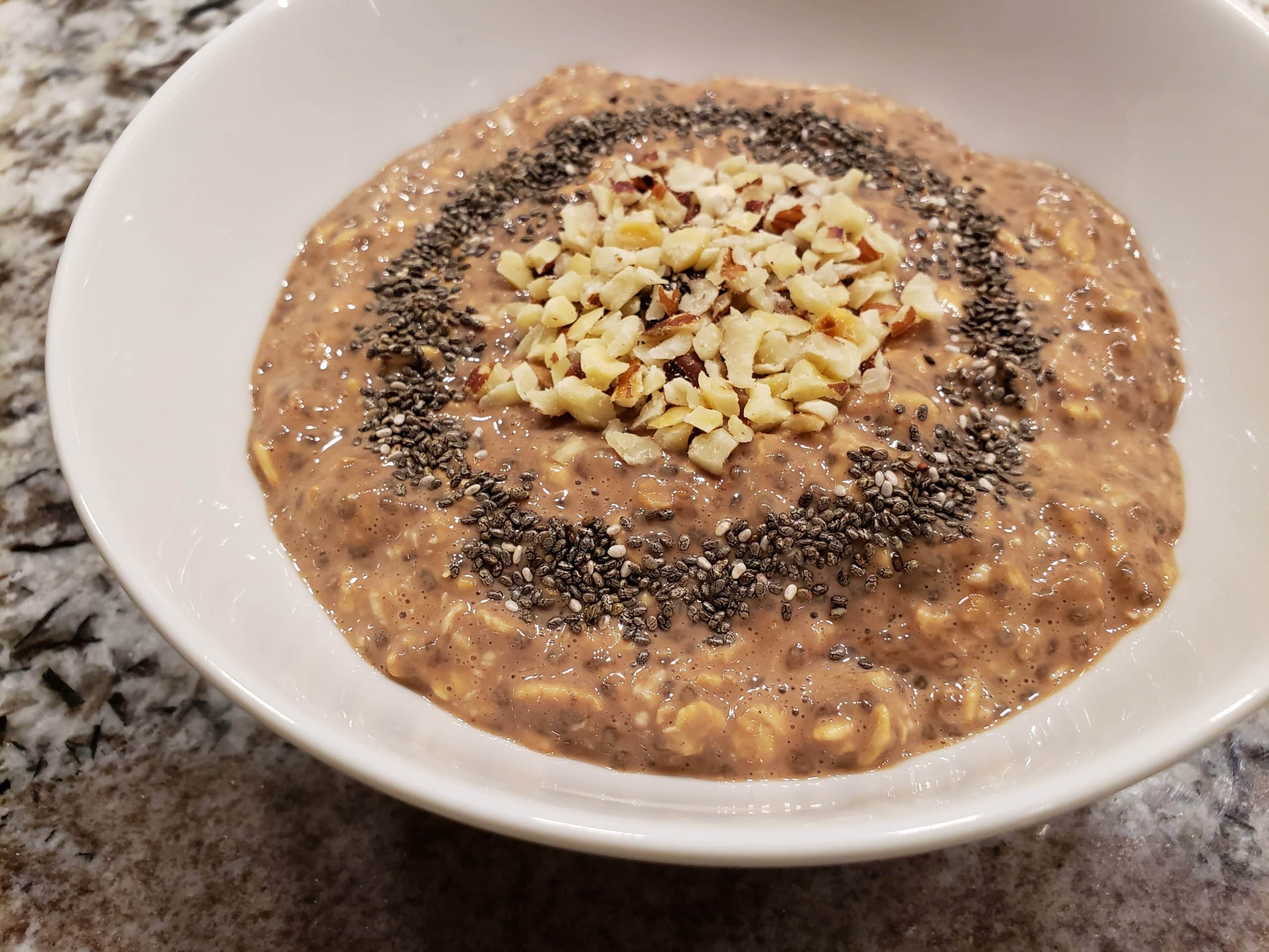 In a jar or bowl, combine oats, chia seeds, cocoa powder, and milk.