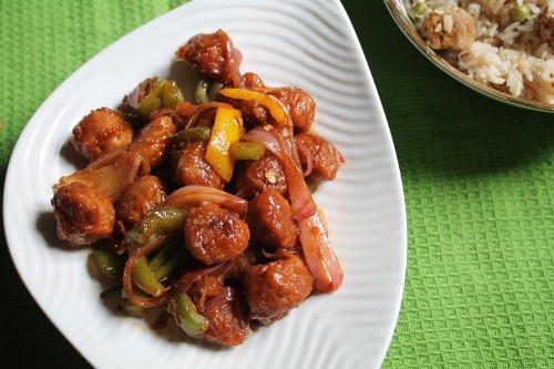 Cook for 2-3 minutes, allowing the sauce to thicken and coat the soya chunks and vegetables evenly.