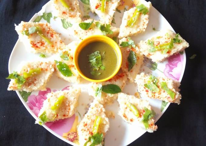 Check with a toothpick; if it comes out clean, the dhokla is ready.