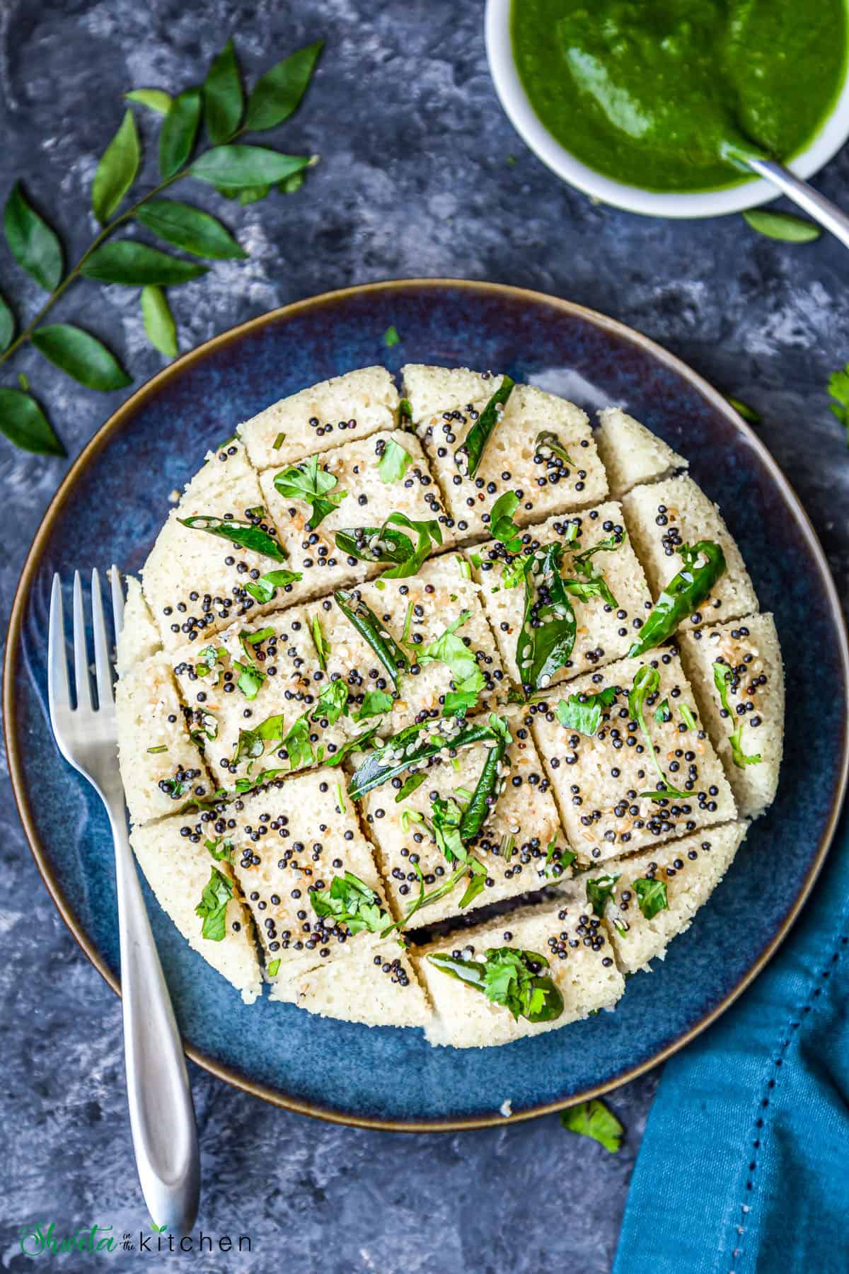Allow the dhokla to cool slightly, then cut it into squares or diamonds.